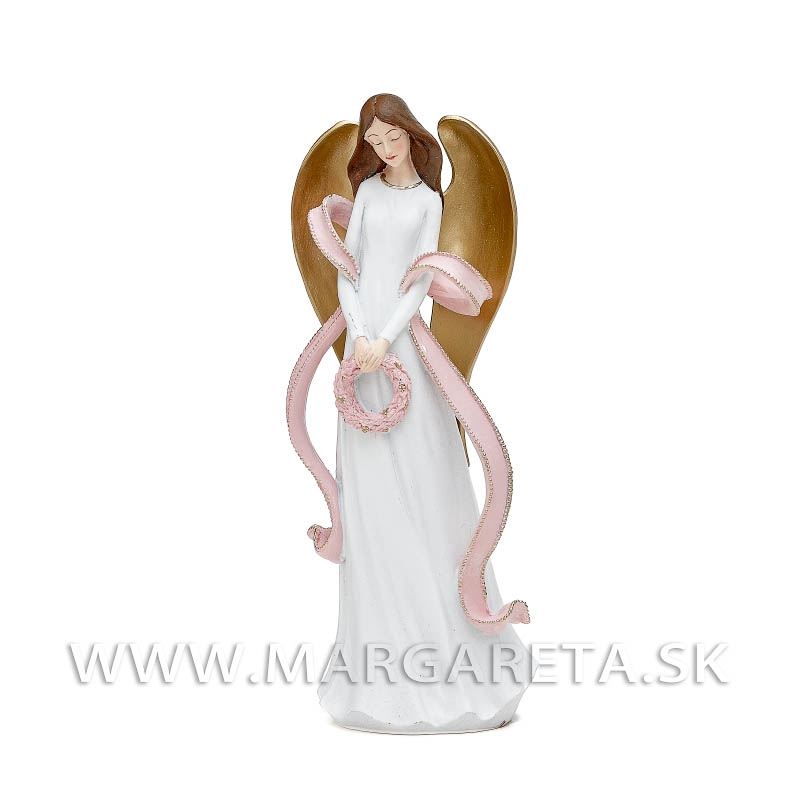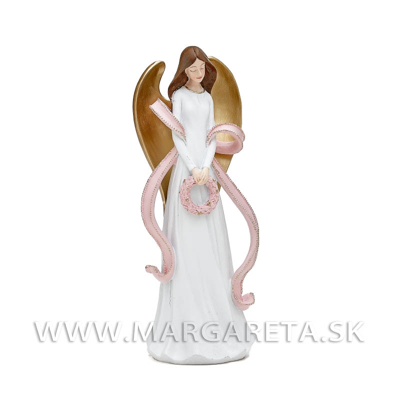 Romantický,snívajúci anjel Mária so stuhou a s venčekom v rukách. Vhodný ako dekorácia do interiérov .